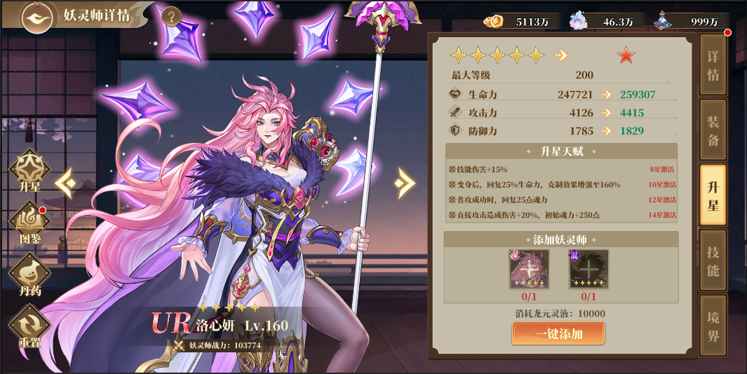 升星可以提高英雄的各項初始屬性,每次升星需要消耗不同條件升星材料,升星達(dá)到指定星級后還可額外解鎖該妖靈師獨有的升星天賦。已經(jīng)滿星或溢出的妖靈師可通過招募——遣散功能進(jìn)行遣散,再用獲得的時空殘卷到秘寶軒的兌換商店中兌換自己所需要的妖靈師。