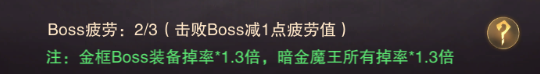 挑戰(zhàn)BOSS需要消耗BOSS疲勞,每天有3次的免費(fèi)挑戰(zhàn)機(jī)會。隨著轉(zhuǎn)生等級的提高,可以挑戰(zhàn)的層數(shù)就越高,其中每層的黃金領(lǐng)主與暗金魔王裝備掉率是1.3倍,建議把次數(shù)都用于挑戰(zhàn)這兩個BOSS。